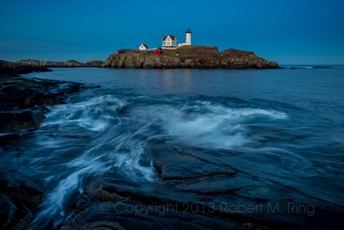 At the end of the day at Nubble Light on the coast of Maine. After the sun goes down the light turns blue! Photo © copyright by Robert M Ring.
